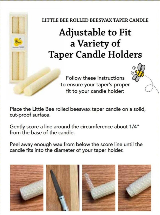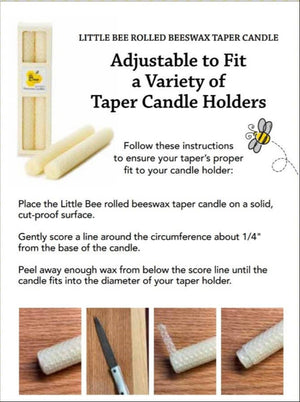Little Bee Hand Rolled Beeswax Taper Candles feature a distinctive honeycomb texture. No other material burns like 100% pure beeswax - it's clean, it's luxurious, and the light is soft and romantic. As they burn, the layers of beeswax become translucent creating a soft glow. With no added fragrance, you will enjoy the authentic subtle scent of natural beeswax.