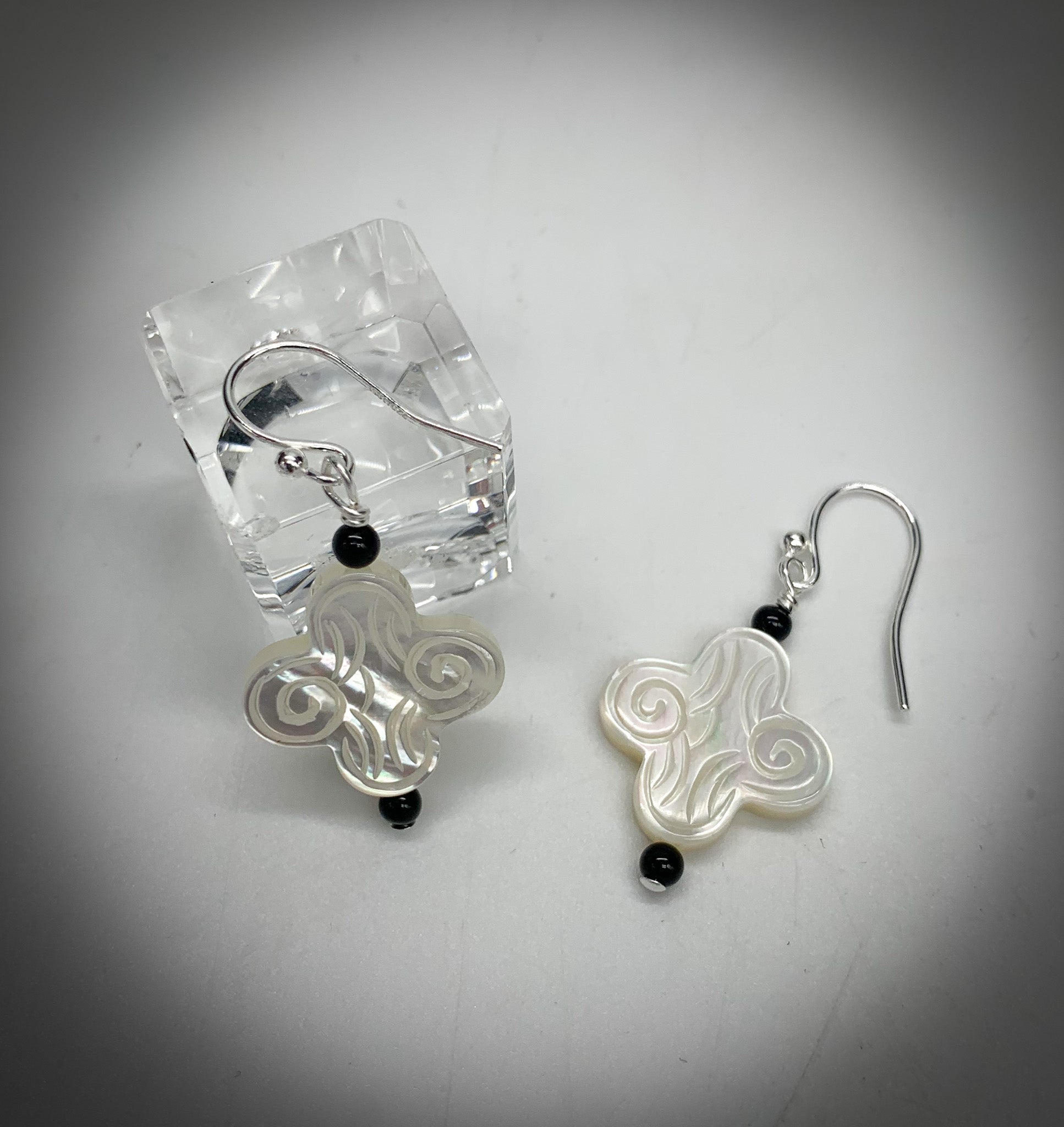 Enhance your style with these stunning earrings featuring a carved mother-of-pearl cross design paired with elegant black onyx. These luxurious earrings are perfect for adding a touch of sophistication and exclusivity to any outfit. Elevate your look with these beautiful statement earrings. Mother of Pearl...