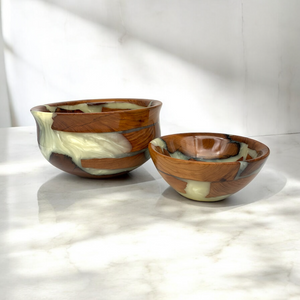 Expertly crafted from cherry wood and white pearl resin, this bowl set is both durable and visually striking. The smaller bowl is made from the inner large bowl. Enjoy the merging of natural and modern elements with this elegant set. Small Bowl- 7.75"W x 3.25"H...