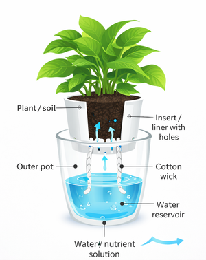 Includes a removable self-watering liner (optional white or black) with drainage/wick holes. Thread a length of cord through the holes (we recommend organic cotton rope) so it hangs into the water reservoir below—the rope gently wicks water up to keep soil evenly moist without the overwatered mess.