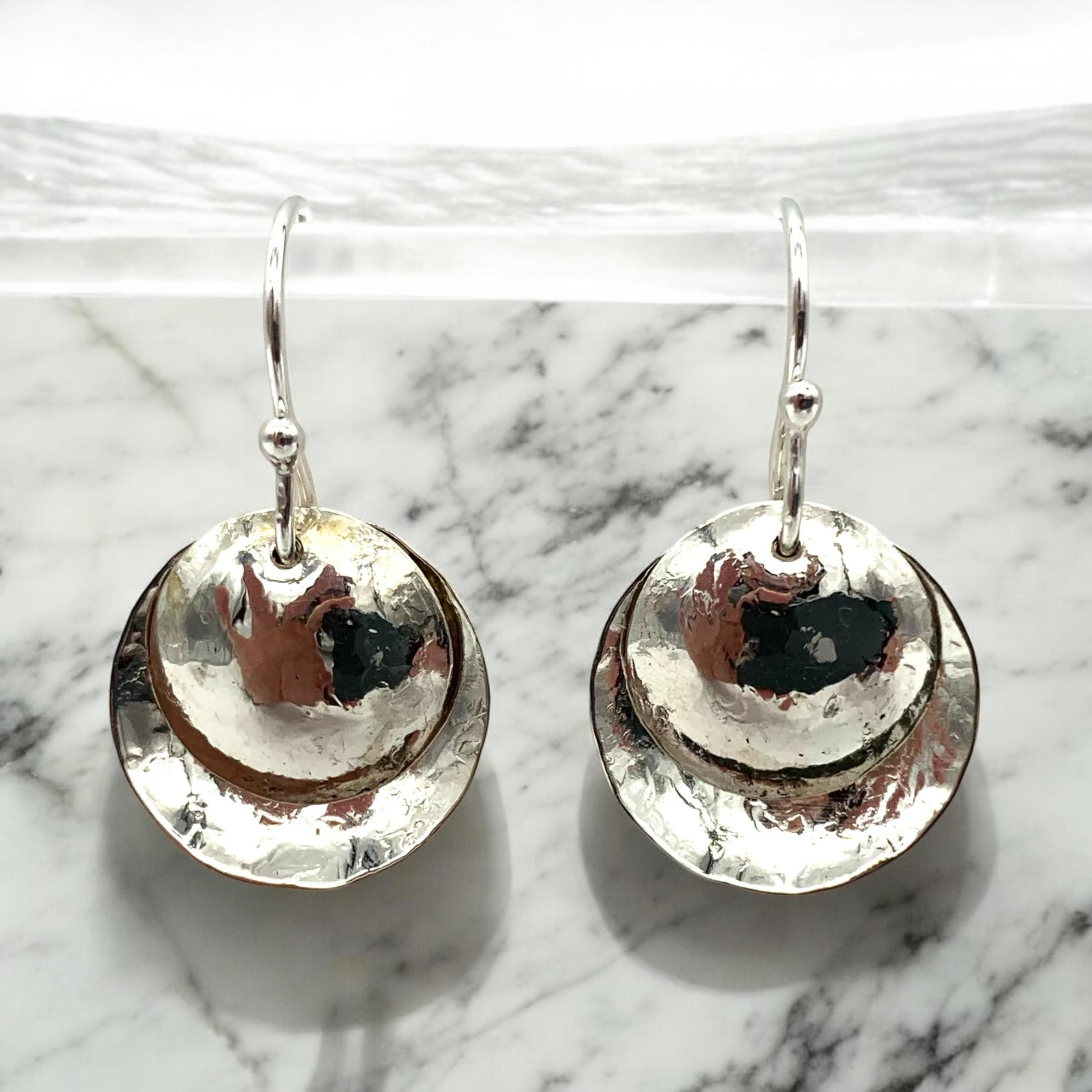 Hand hammered sterling silver circles suggest an eclipse as they gracefully swing.