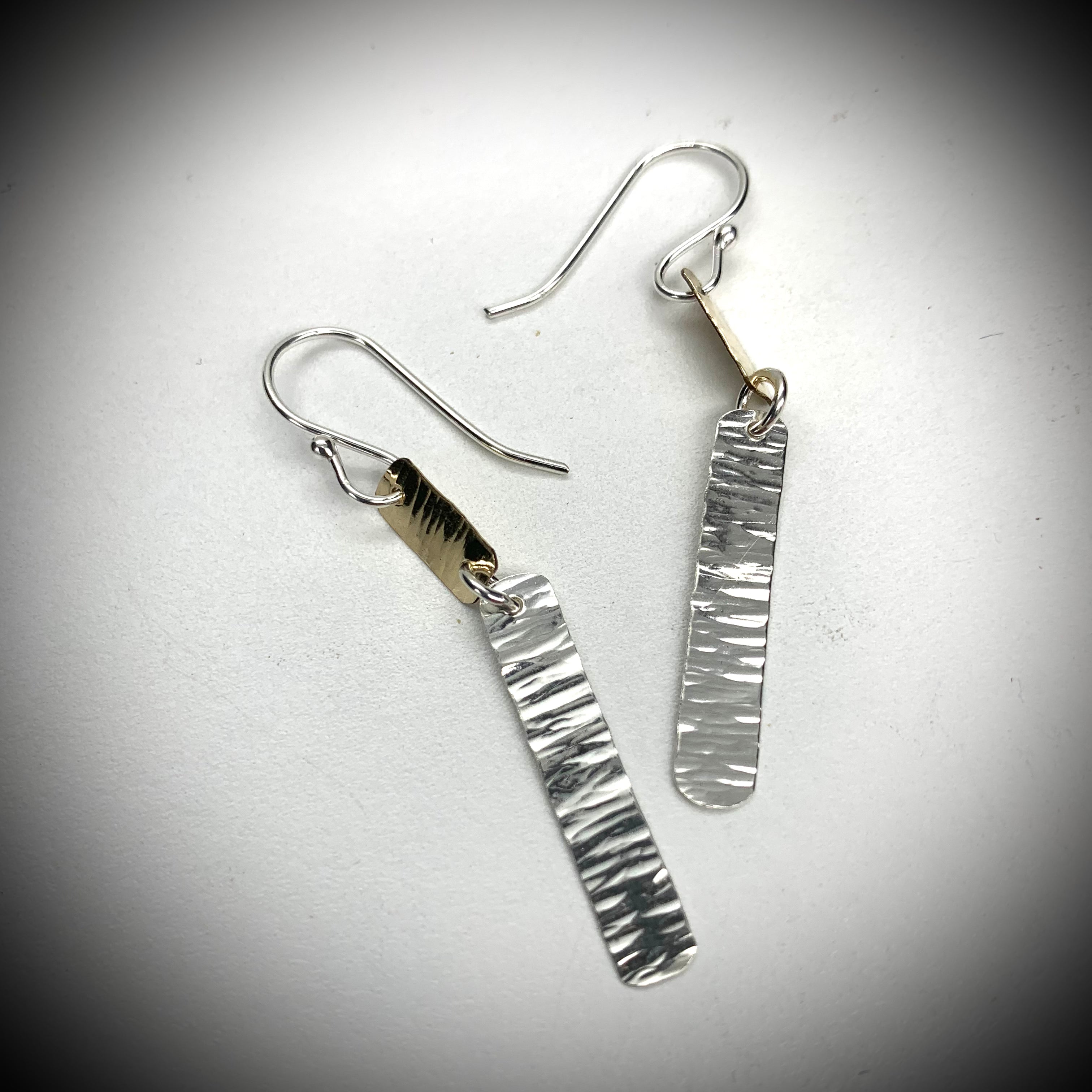 Each piece is cut, bent, formed, and hammered by hand. The earrings are sterling silver and 14k gold filled, both of which are nickel-free.