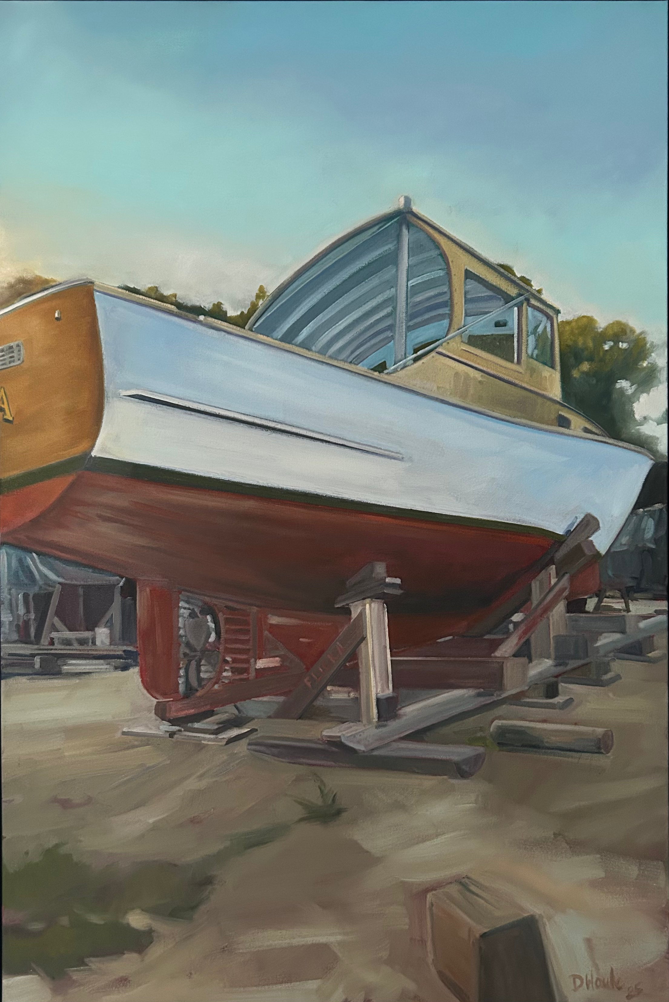 This original oil painting, titled "Flicka," captures a lobster boat resting in dry dock in Newcastle, Maine. The piece skillfully conveys the rugged charm and maritime heritage of the region, offering an authentic portrayal that resonates with collectors and admirers of coastal art. Its expert brushwork and composition make it a distinguished addition to any fine art collection.