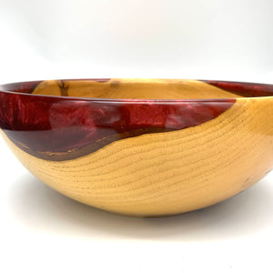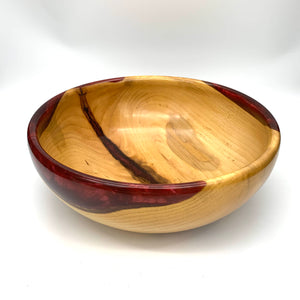 Handcrafted from strong and durable hickory wood, this bowl is beautifully accented with a deep red resin. The combination of materials creates a unique and eye-catching design, perfect for displaying fruits, serving snacks, or as a standalone piece. Bring a touch of natural elegance to any space with this artisan bowl.