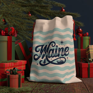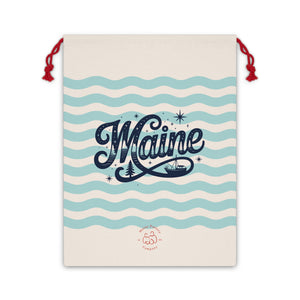 Vintage-inspired illustrated 'Maine' typography design drawstring gift bag perfect for holiday gift giving. This spacious bag with a sewn-in drawstring closure is made of a durable polyester and cotton blend, adding a touch of charm to any present. Ideal for those who appreciate unique and whimsical packaging, perfect for Christmas, birthdays, and special occasions.