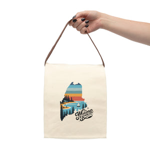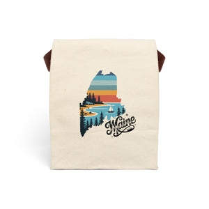 Maine State Retro Lunch Bag with Strap made from 100% natural canvas fabric. Perfect eco-friendly tote for kids and adults for back to school, picnics, and snacks. Gives off a vintage vibe and is relevant for everyday use or special occasions like school days and picnics.