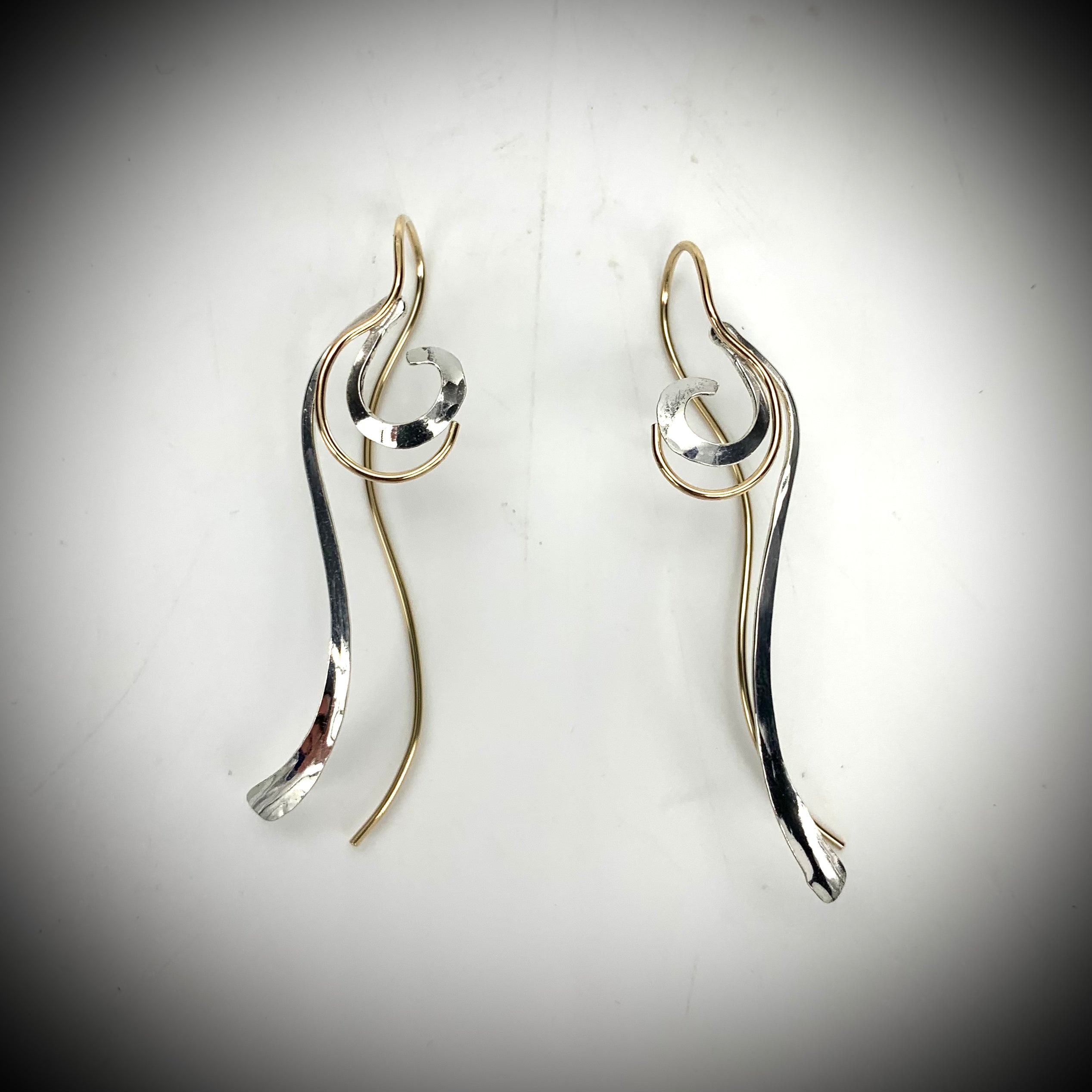 An artistic expression of a mother rocking her baby to sleep at night, in sterling silver and 14kt gold fill.