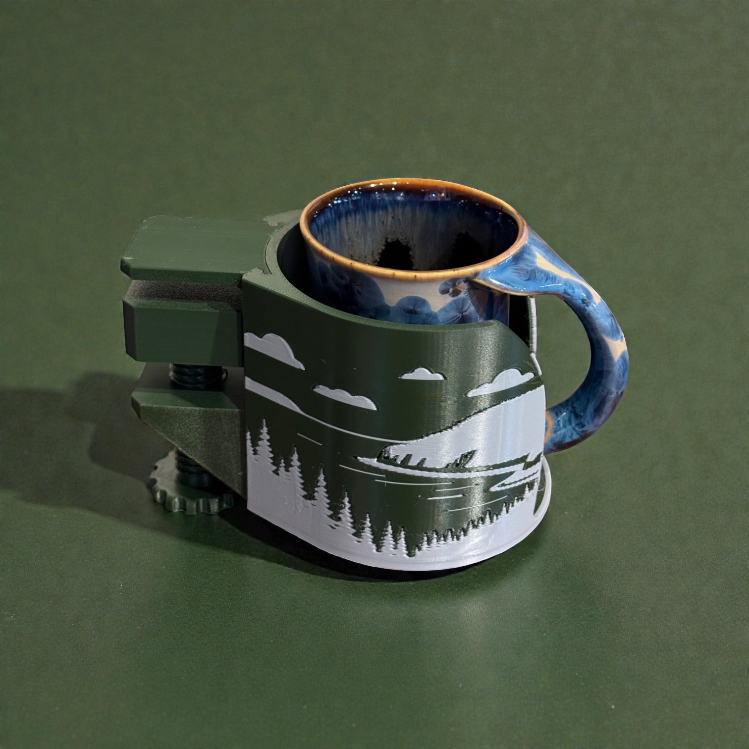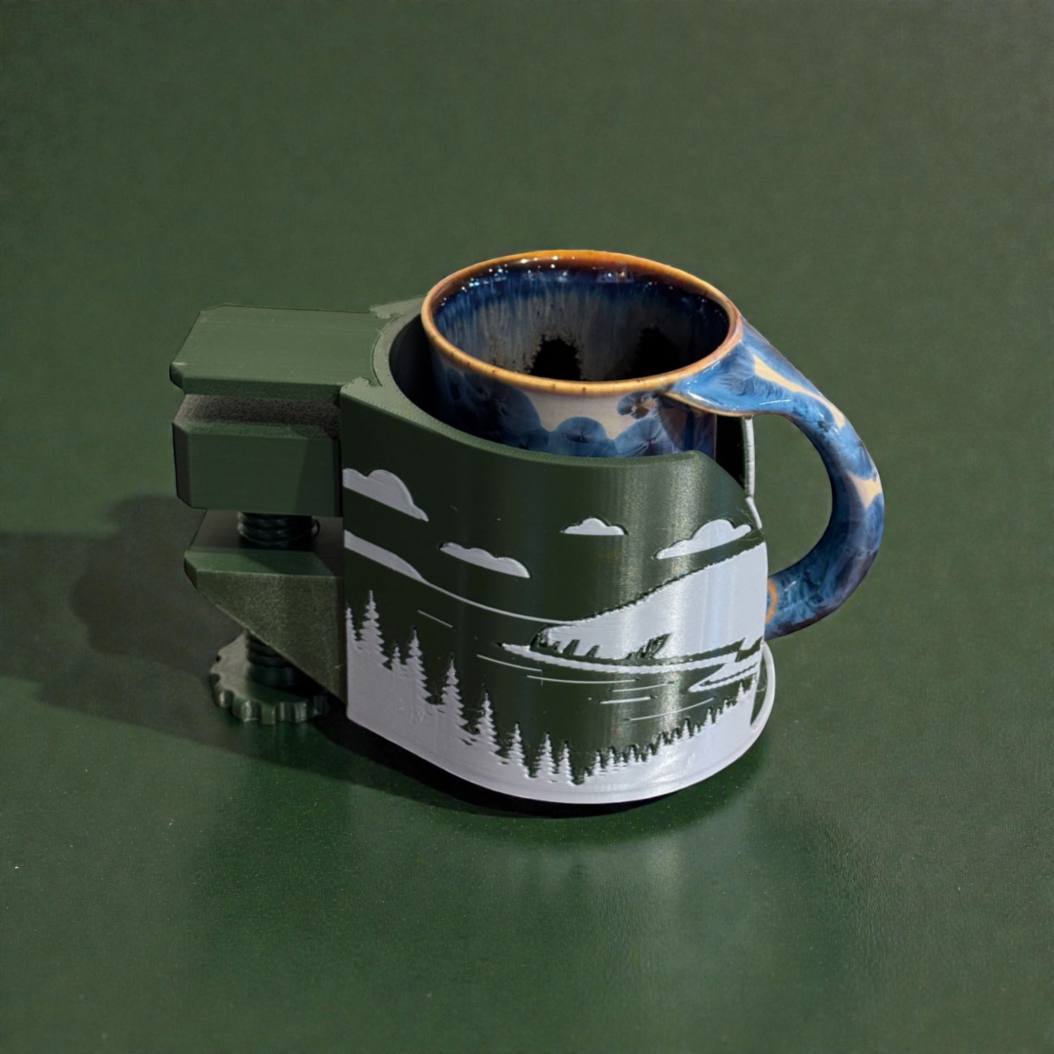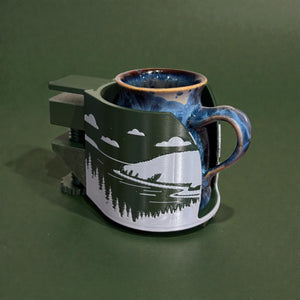 Each Mug Dock is designed and made in Maine by us, printed in durable PETG for strength, heat resistance, and everyday use. The clamp system provides a solid hold without permanent installation, and the open-front design accommodates wide handles and thicker mug walls.
