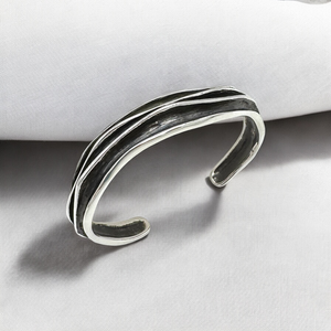 Discover the art of modern sophistication with our Waves Silver Cuff Bracelet. This distinctive piece features a striking design of layered silver bands, each flowing seamlessly into the next, creating a dynamic sense of depth and movement. The interplay between polished and oxidized finishes adds a bold contrast that accentuates the sculptural quality of the bracelet.