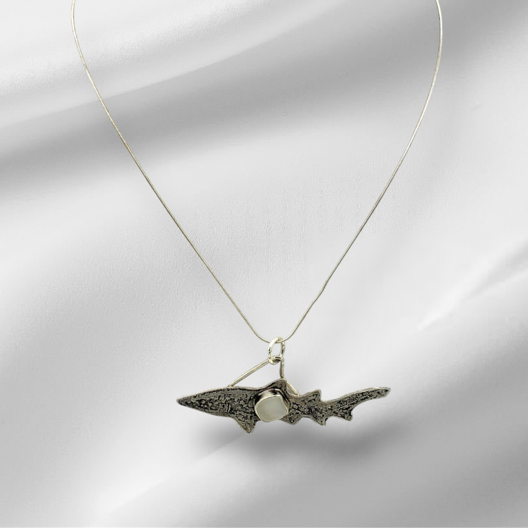 Indulge in a touch of ocean-inspired luxury with our Opalescent Sea Glass Shark Pendant. Crafted with stunning opalescent sea glass, this pendant features a sleek and unique shark design. A perfect way to add an elegant and exclusive touch to any outfit. Sterling Silver 18"...