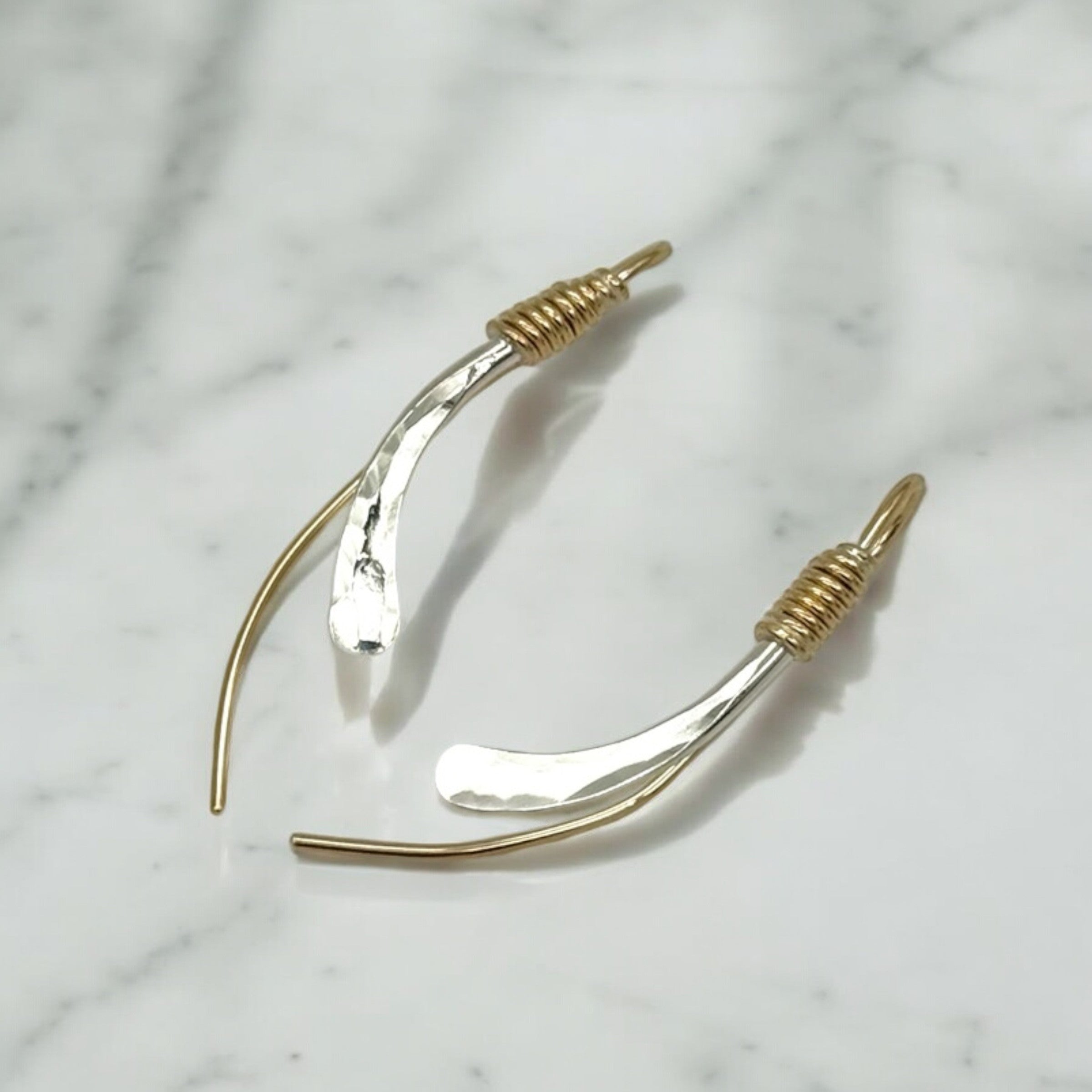 Long flowing hammered blades wrapped in gold wire.