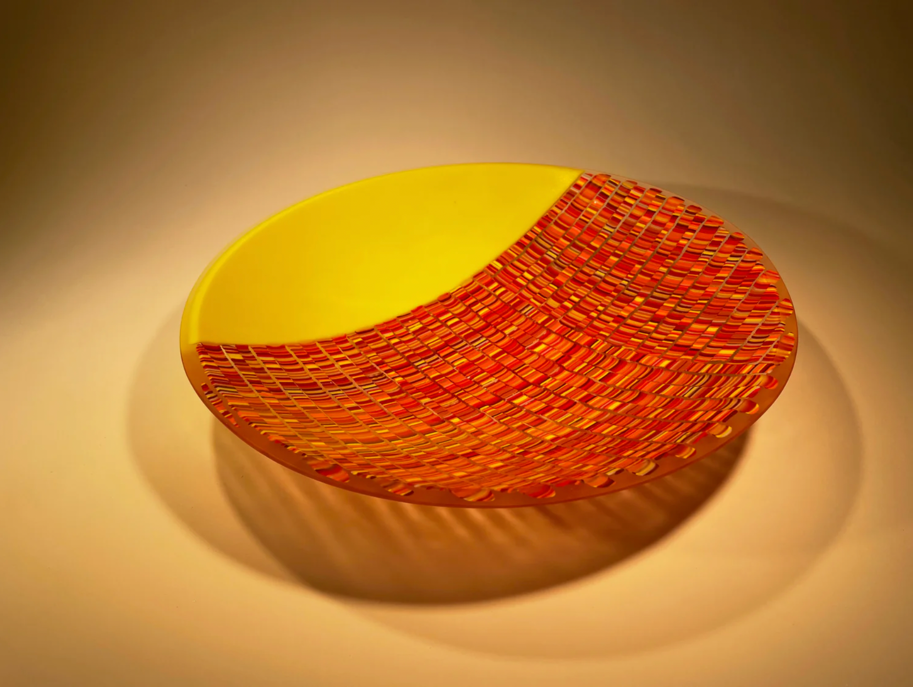 Multiple steps of fusing went into creating this high energy bowl. Food safe but is not microwave or oven safe. Hand wash only. Do not use sharp implements on surface of bowl as they may mar the glass. 13.75" diameter, stands 2" tall Made...