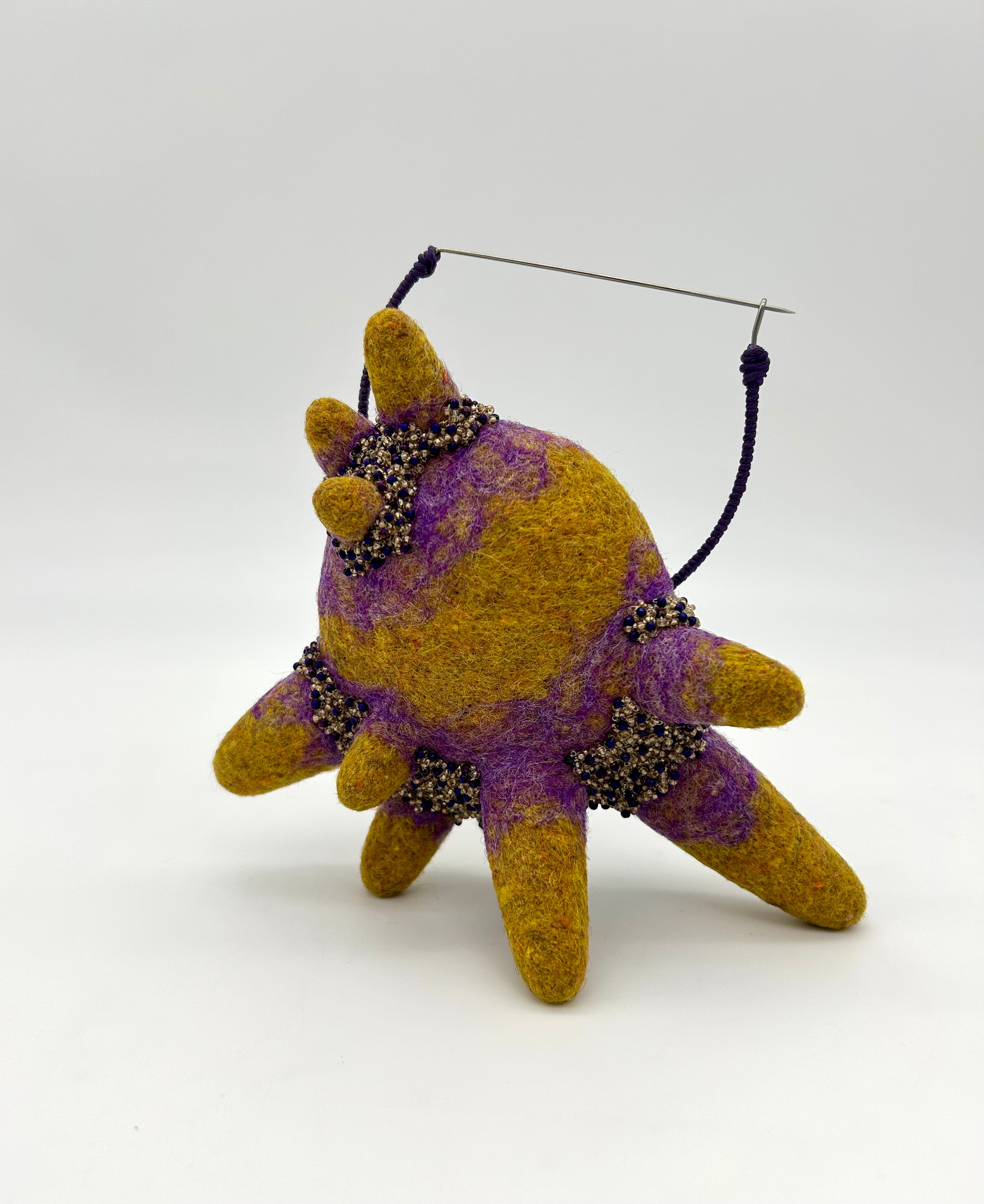Add a playful pop of color to any outfit with our Starburst Urchin Spike Brooch. Its unique design, inspired by the vibrant hues of yellow and purple, is crafted with expert needle felting and accented with beautifully plated hematite beads. The perfect accessory for those...