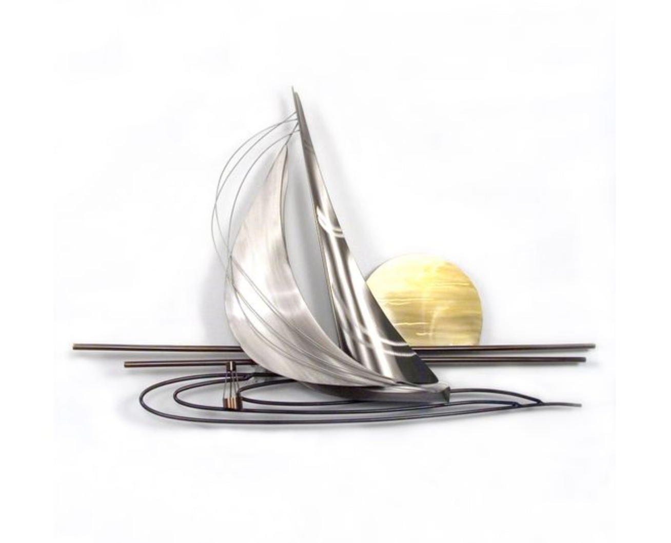 Experience the beauty of a sunset on the ocean with our stunning Sunset Sail metal wall sculpture. Crafted with detail and precision, this sculpture captures the essence of a serene sailing experience. Made to elevate your home decor, it's the perfect addition for any ocean lover.