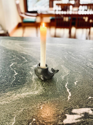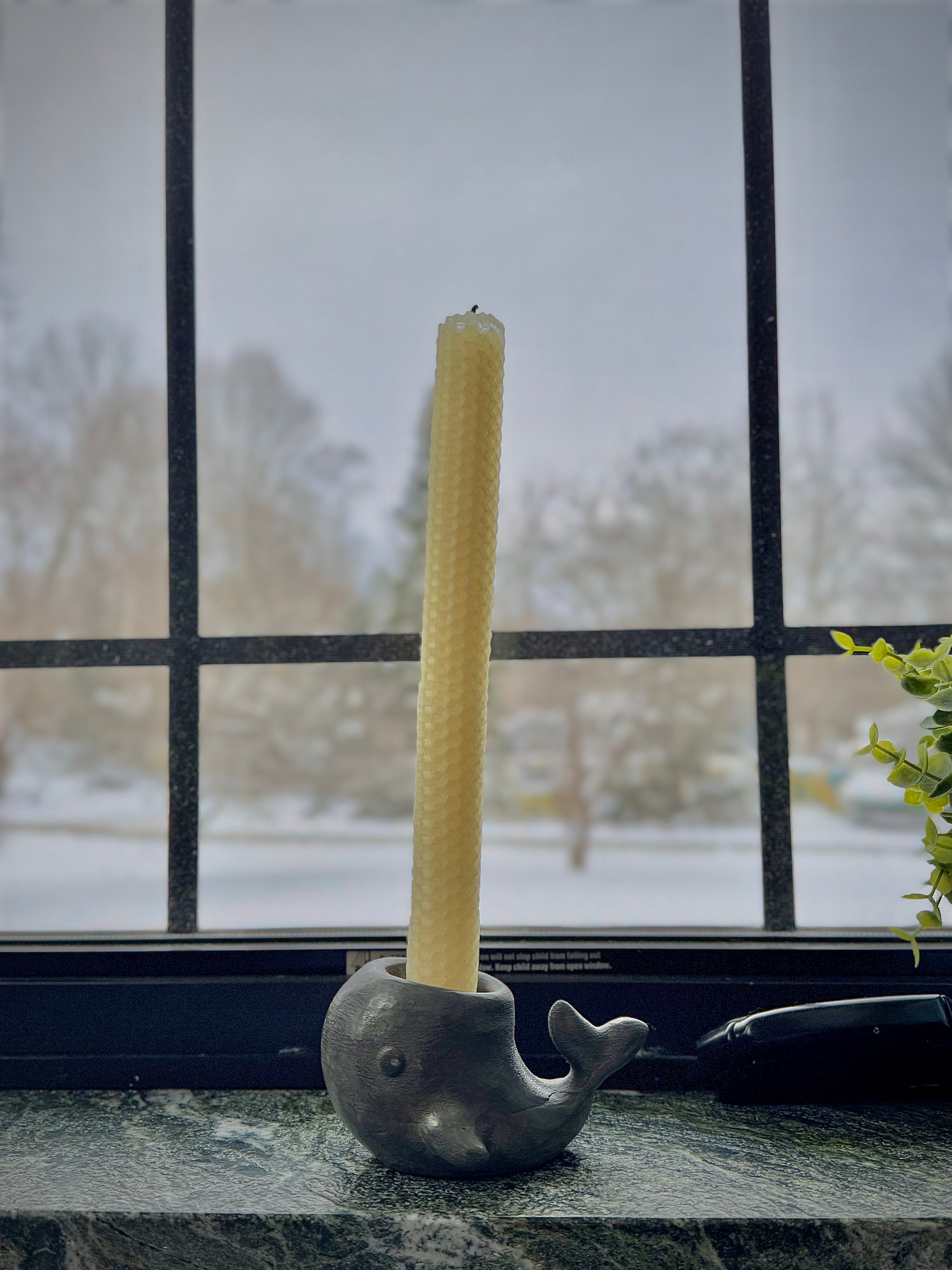 A small steel whale with a big presence. This sculptural candle holder is designed in our Maine studio, then 3D printed, formed, and hand-finished—polished, sanded, and shaped until it feels smooth, substantial, and satisfyingly heavy in the hand.